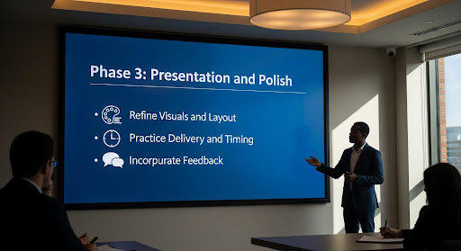 The last phase is on polish—developing tone, emotional resonance, and delivery—after the information has been completely developed. At this point, the presentation transforms from an educational deck into an unforgettable show. AI is used in the polish process not only as a writer but also as a communication coach, modifying tone, mimicking audience responses, and making sure every word, slide, and pause has a purpose.